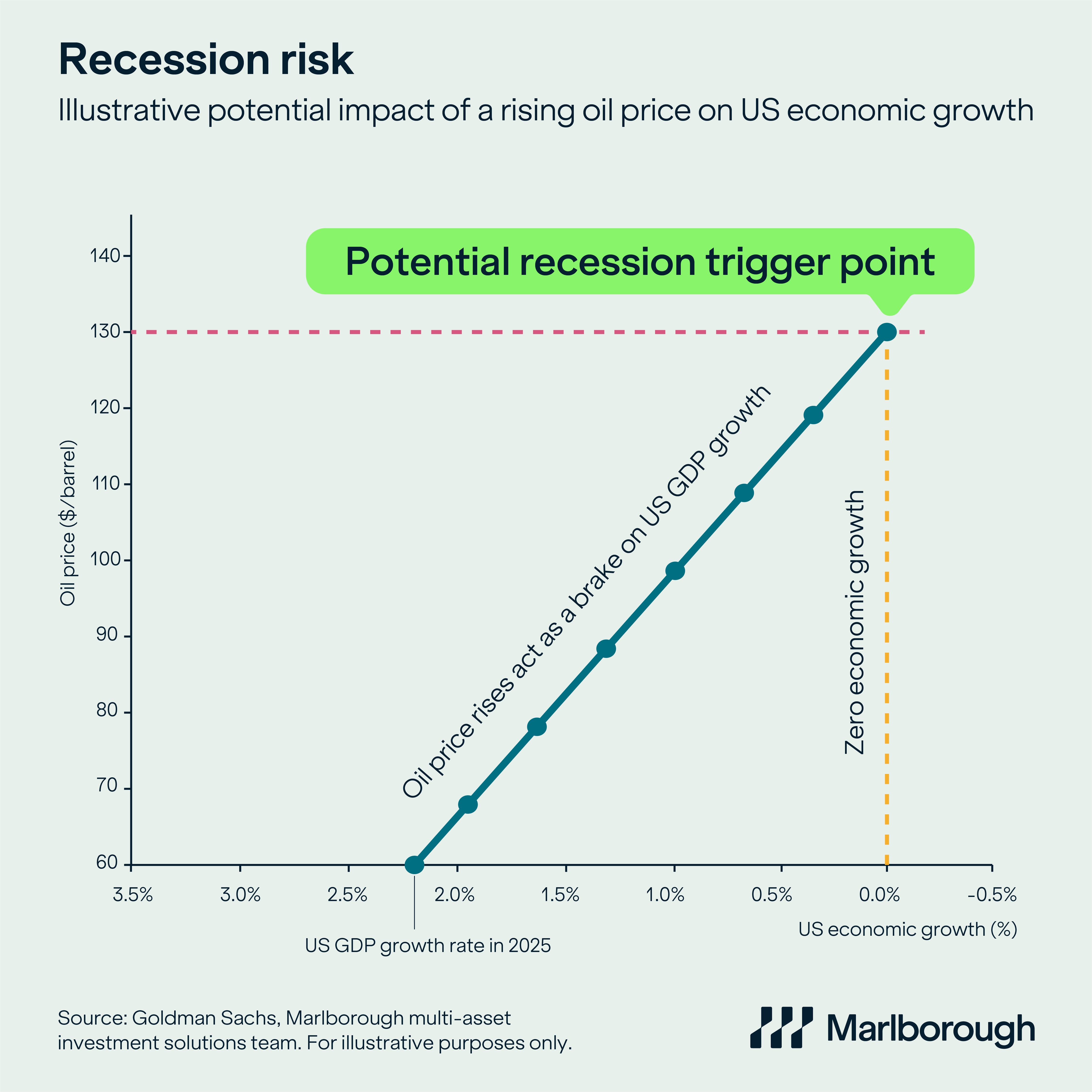 In today’s chart we’re looking again at the economic impact of the oil price. Economists often use a simple rule of thumb – every $10 increase in oil prices tends to add around 0.3% to inflation and subtract around 0.3% from US economic growth. Using a baseline of US economic growth (as measured by gross domestic product or GDP) of around 2.2% in 2025, provides a useful starting point for our analysis.
